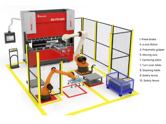 Современная изгибающая ячейка разработана для повышения эффективности, Автоматизированные операции по гибке листового металла. Его планировка оптимизирована для обеспечения плавного потока материалов, точность, и безопасность оператора. Основные компоненты обычно включают:
